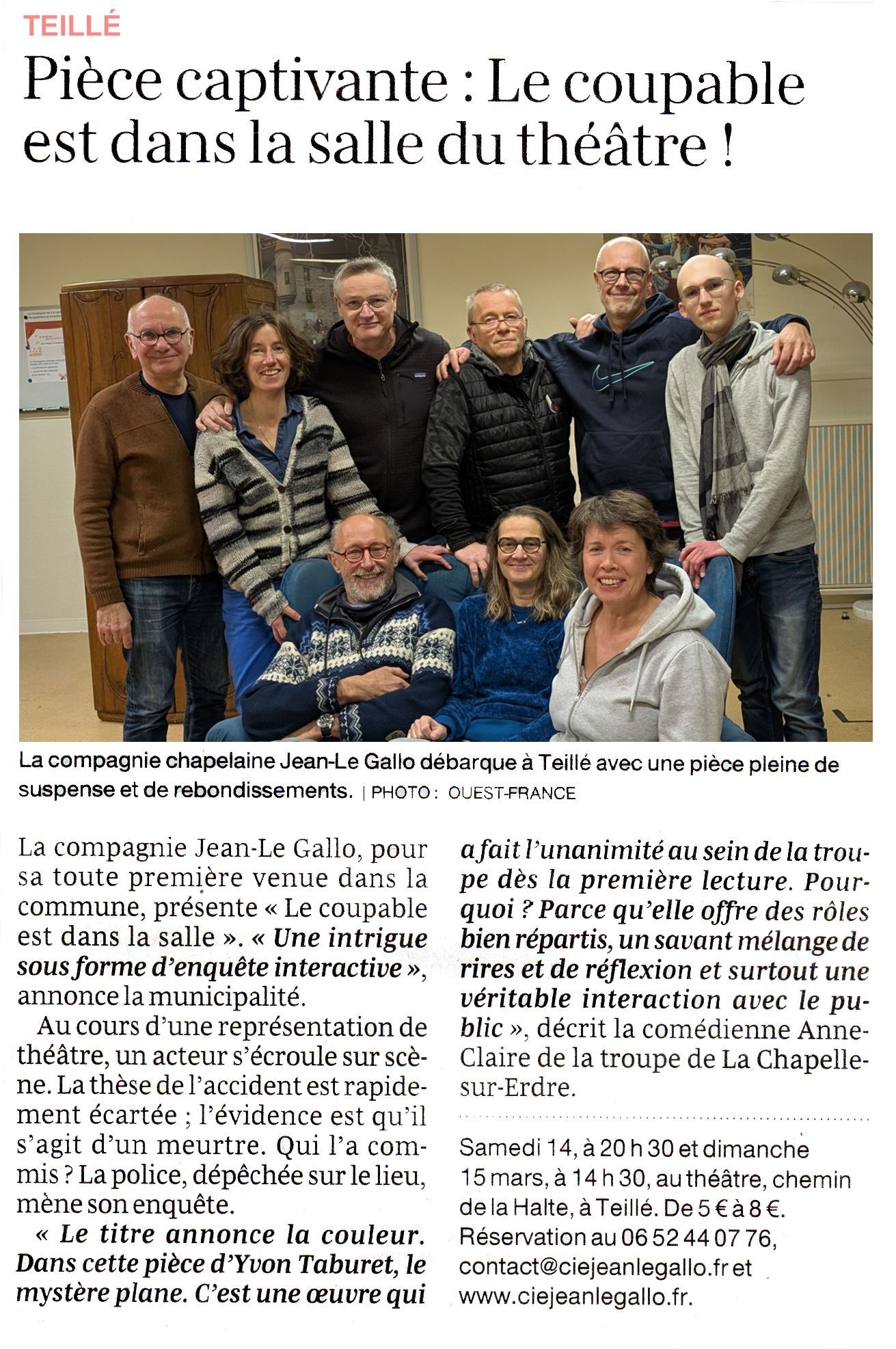 10 € Adulte - 5 € moins de 12 ansAuparavant, nous nous produirons au théâtre de Teillé le samedi 14 mars à 20h30 et le dimanche 15 mars 2026 à 14h30.